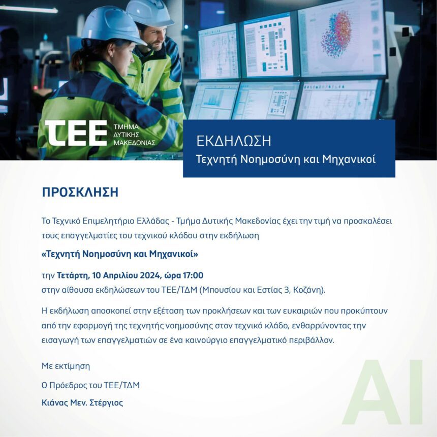 Εκδήλωση με θέμα "Τεχνητή Νοημοσύνη και Μηχανικοί" οργανώνει το Τεχνικό Επιμελητήριο Ελλάδας - Τμήμα Δυτικής Μακεδονίας, την Τετάρτη, 10 Απριλίου 2024, στις 17:00, στην αίθουσα εκδηλώσεων του ΤΕΕ/ΤΔΜ στην Κοζάνη.…