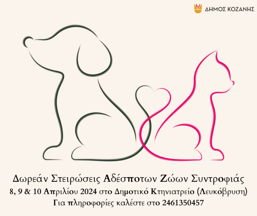 Μία ακόμη δράση με δωρεάν στειρώσεις αδέσποτων σκύλων και γατών από εθελοντές κτηνιάτρους υλοποιεί ο Δήμος Κοζάνης, στοχεύοντας στην ενίσχυση του ολοκληρωμένου προγράμματος διαχείρισης αδέσποτων ζώων συντροφιάς, που ήδη εκπονεί.…