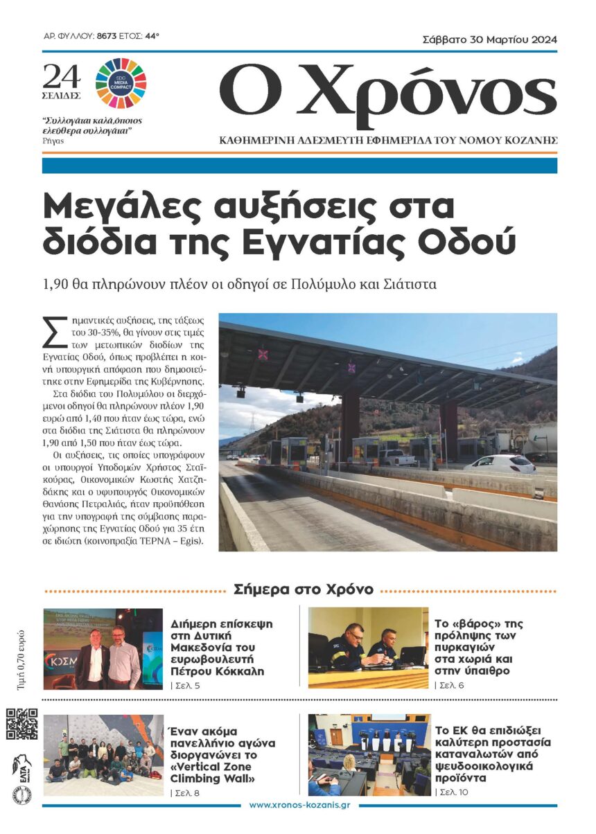 1,90 θα πληρώνουν πλέον οι οδηγοί σε Πολύμυλο και Σιάτιστα Σημαντικές αυξήσεις, της τάξεως του 30-35%, θα γίνουν στις τιμές των μετωπικών διοδίων της Εγνατίας Οδού, όπως προβλέπει η κοινή…