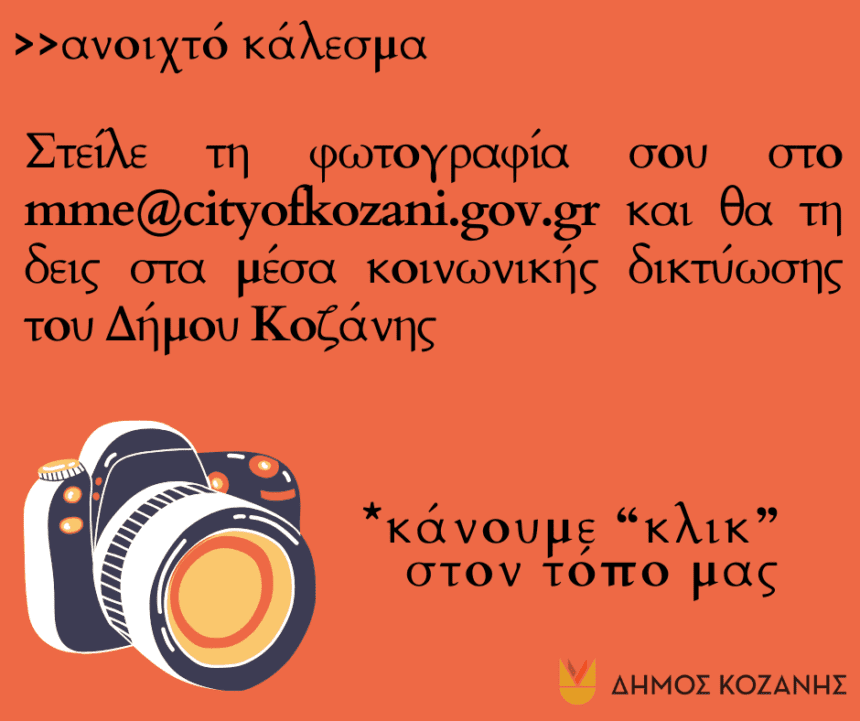 Κάλεσμα του Δήμου Κοζάνης για φωτογραφίες πολιτών με την ομορφιά πόλης και χωριών Ο Δήμος Κοζάνης απευθύνει κάλεσμα συμμετοχής σε όλες και όλους που θέλουν να συμβάλλουν στη διαμόρφωση της…