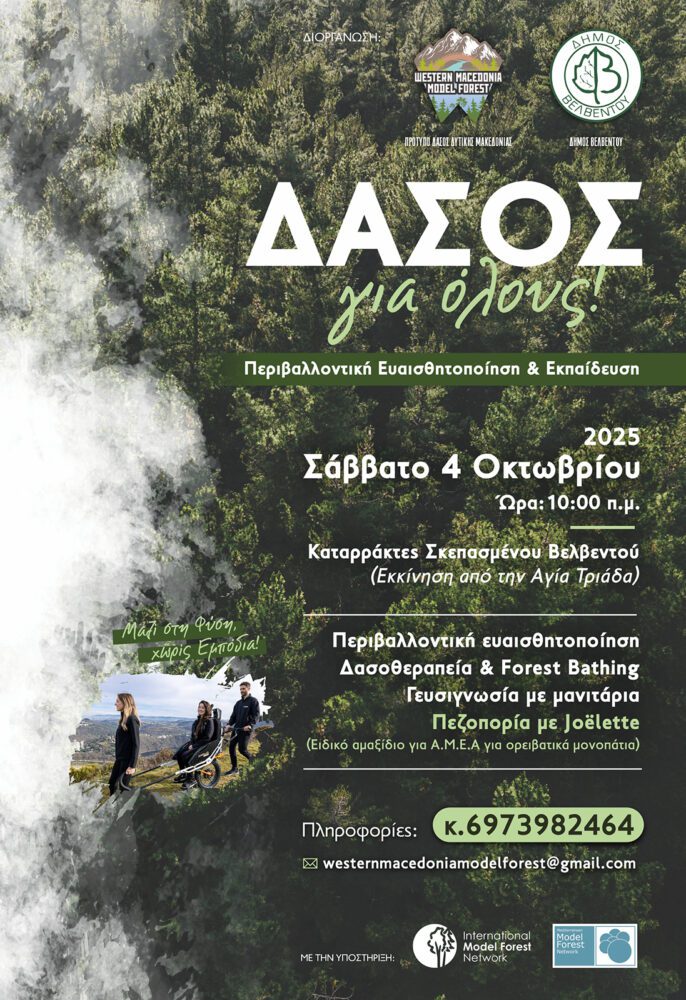 Περιβάλλοντας το φυσικό τοπίο του Σκεπασμένου στο Δήμο Βελβεντού, το Πρότυπο Δάσος Δυτικής Μακεδονίας, σε συνεργασία με τον Δήμο Βελβεντού και με την υποστήριξη του Διεθνούς και Μεσογειακού Δικτύου Πρότυπων Δασών, διοργανώνει το Σάββατο 4 Οκτωβρίου 2025 μια ανοιχτή εκδρομή με τίτλο «Δάσος για Όλους». Στόχος είναι η περιβαλλοντική ευαισθητοποίηση, η ανάδειξη της αξίας των πρότυπων δασών και η προώθηση της ευεξίας μέσω της επαφής με τη φύση.