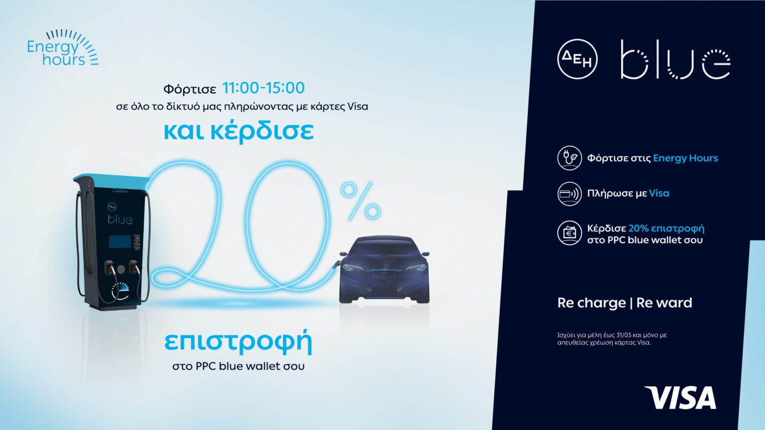 Συγκεκριμένα, οι οδηγοί που φορτίζουν το όχημά τους στο δημόσια προσβάσιμο δίκτυο ΔΕΗ blue, καθημερινά στις Energy Hours, από τις 11:00 έως τις 15:00 και πραγματοποιούν τις συναλλαγές τους με κάρτα Visa, εξασφαλίζουν επιστροφή 20% στο PPC blue wallet τους. Η προωθητική ενέργεια εμφανίζεται στη σχετική ενότητα PPC blueSpecials της εφαρμογής PPC blue, ενώ η πίστωση πραγματοποιείται απευθείας στο ψηφιακό πορτοφόλι του κάθε χρήστη και μπορεί να αξιοποιηθεί για επόμενες φορτίσεις.