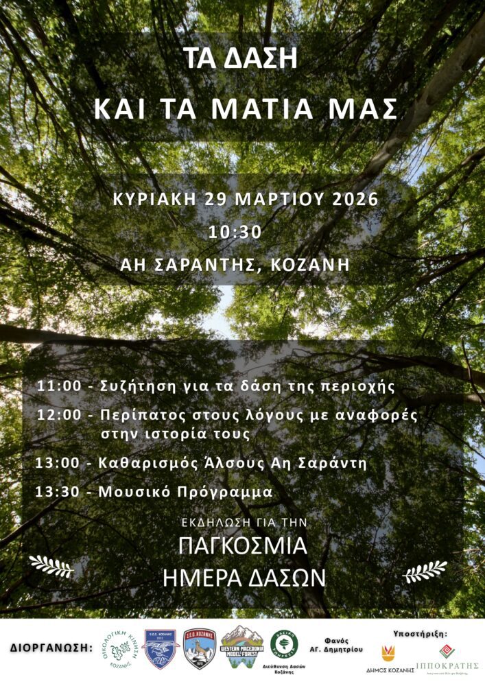 Με αφορμή την Παγκόσμια Ημέρα Δασών, η Οικολογική Κίνηση Κοζάνης, ο Φανός Αγίου Δημητρίου, η Διεύθυνση Δασών Κοζάνης, οι ορειβατικοί σύλλογοι Ε.Ο.Σ. και Σ.Ε.Ο. Κοζάνης και το Πρότυπο Δάσος Δυτικής Μακεδονίας διοργανώνουν δράσεις με τίτλο «Τα Δάση και τα μάτια μας», την Κυριακή 29 Μαρτίου 2026 στον Αη Σαράντη.