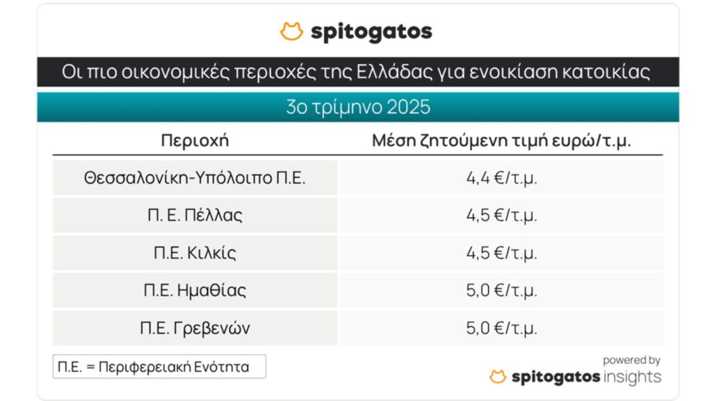 - Στις ενοικιάσεις, οι πιο ακριβές περιοχές ξεπερνούν τα 13 €/τ.μ., τη στιγμή που σε Γρεβενά και άλλες περιοχές της Δυτικής Μακεδονίας παραμένουν στις χαμηλότερες τιμές πανελλαδικά.