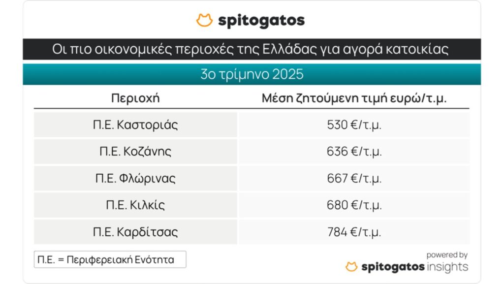 Παρά τη γενικευμένη άνοδο, η Δυτική Μακεδονία εξακολουθεί να βρίσκεται στις πιο οικονομικές περιοχές της χώρας για αγορά κατοικίας. Οι Περιφερειακές Ενότητες Καστοριάς, Κοζάνης και Φλώρινας συγκαταλέγονται στο top 5 των φθηνότερων περιοχών, προσφέροντας σημαντικά χαμηλότερες τιμές σε σχέση με τα μεγάλα αστικά κέντρα.