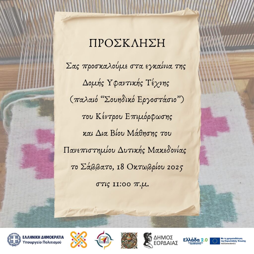 Στο πλαίσιο της επίσκεψής της στην περιοχή θα λάβουν χώρα και τα εγκαίνια της Δομής Υφαντικής Τέχνης στη Βλάστη του Δήμου Εορδαίας το Σάββατο 18 Οκτωβρίου 2025 και ώρα 11:00.