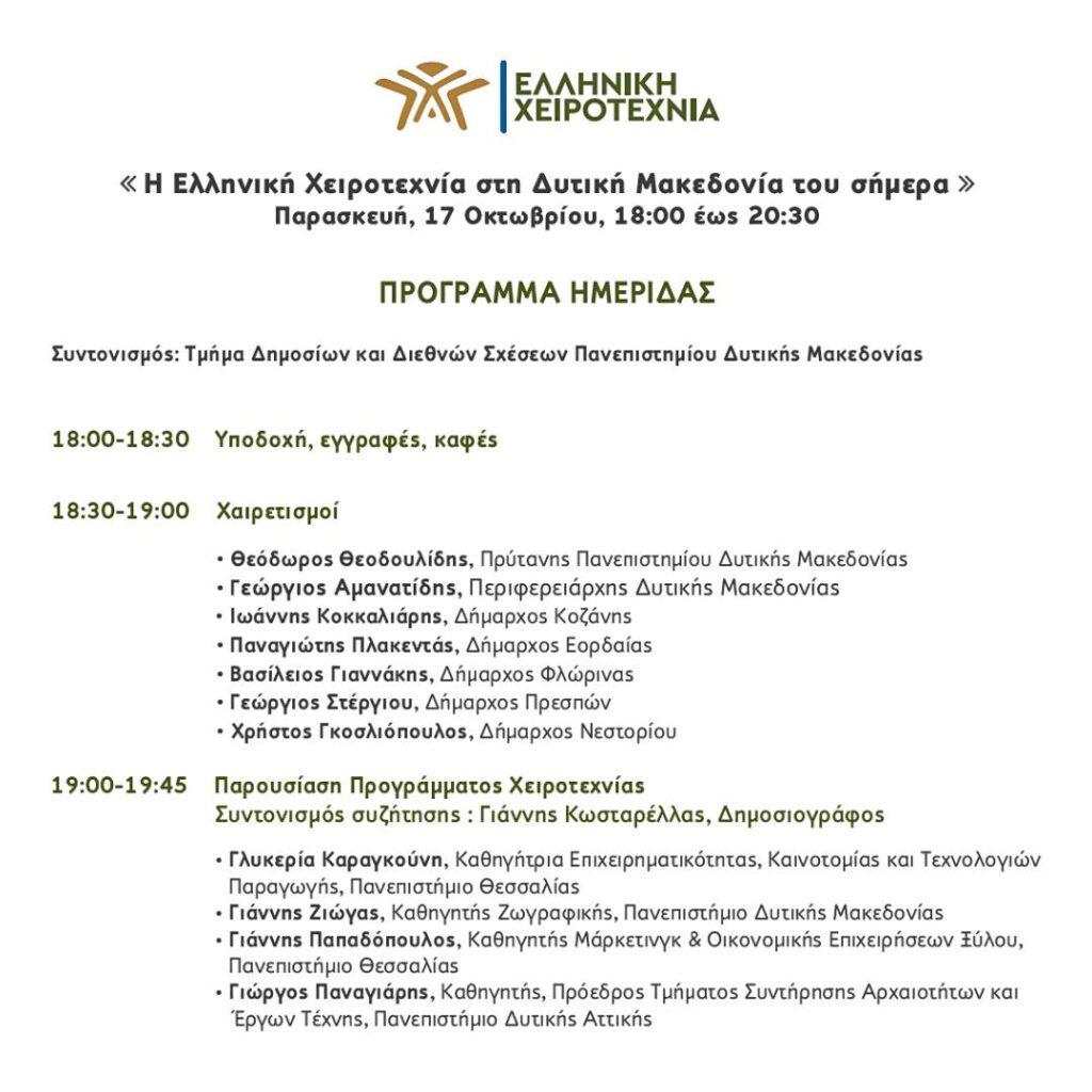 Το Υπουργείο Πολιτισμού σε συνεργασία με το Πανεπιστήμιο Δυτικής Μακεδονίας, το Πανεπιστήμιο Θεσσαλίας και το Πανεπιστήμιο Δυτικής Αττικής οργανώνει ημερίδα με θέμα: «Η Ελληνική Χειροτεχνία στη Δυτική Μακεδονία του σήμερα».