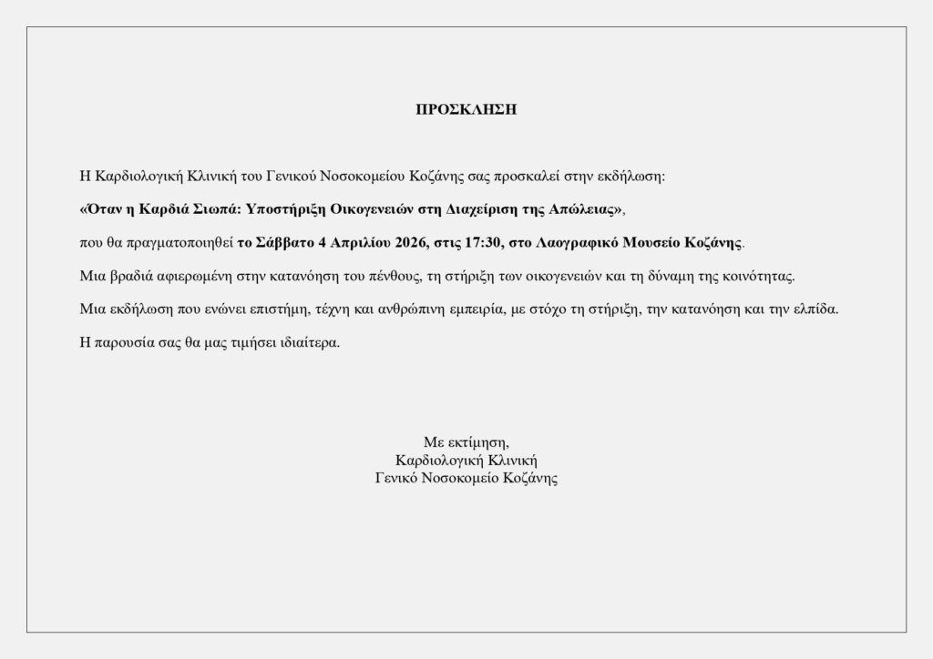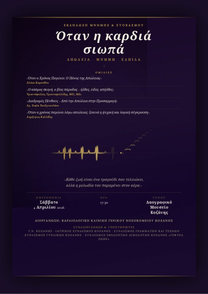 Εκδήλωση με θέμα τη διαχείριση της απώλειας και τη στήριξη των οικογενειών διοργανώνει η Καρδιολογική Κλινική του Γενικού Νοσοκομείου Κοζάνης, το Σάββατο 4 Απριλίου 2026, στις 17:30, στο Λαογραφικό Μουσείο Κοζάνης, σε μια πρωτοβουλία που συνδυάζει επιστημονική προσέγγιση, ανθρώπινη εμπειρία και καλλιτεχνική έκφραση.