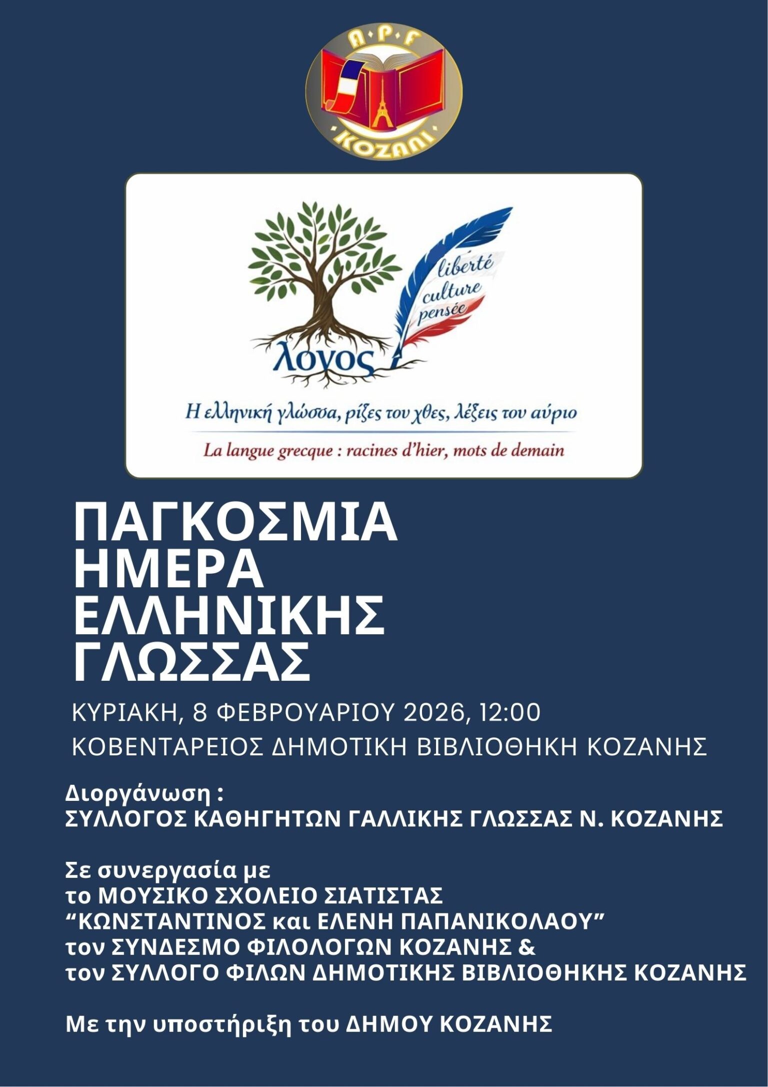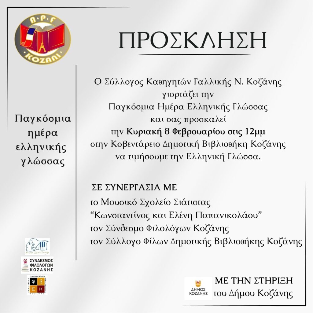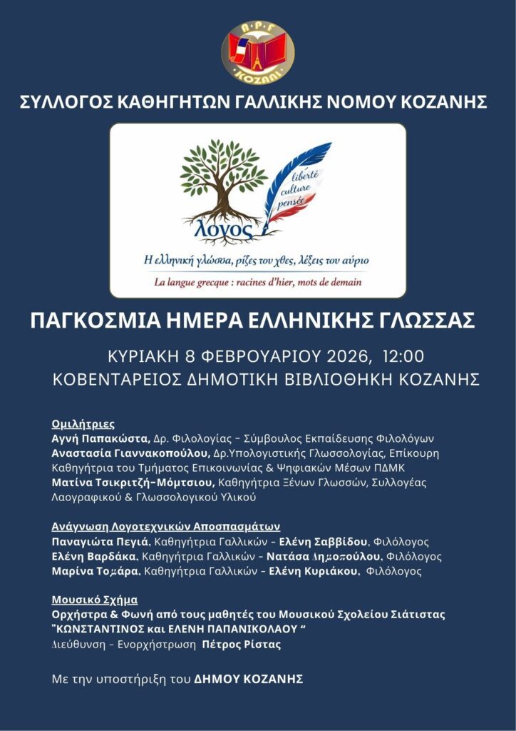 Εκδήλωση αφιερωμένη στη διαχρονική αξία της ελληνικής γλώσσας και στη συμβολή της στον ευρωπαϊκό και παγκόσμιο πολιτισμό διοργανώνει ο Σύλλογος Καθηγητών Γαλλικής Γλώσσας Νομού Κοζάνης, την Κυριακή 8 Φεβρουαρίου 2026, στις 12:00, στην Κοβεντάρειο Δημοτική Βιβλιοθήκη Κοζάνης, στο πλαίσιο της Παγκόσμιας Ημέρας Ελληνικής Γλώσσας.
