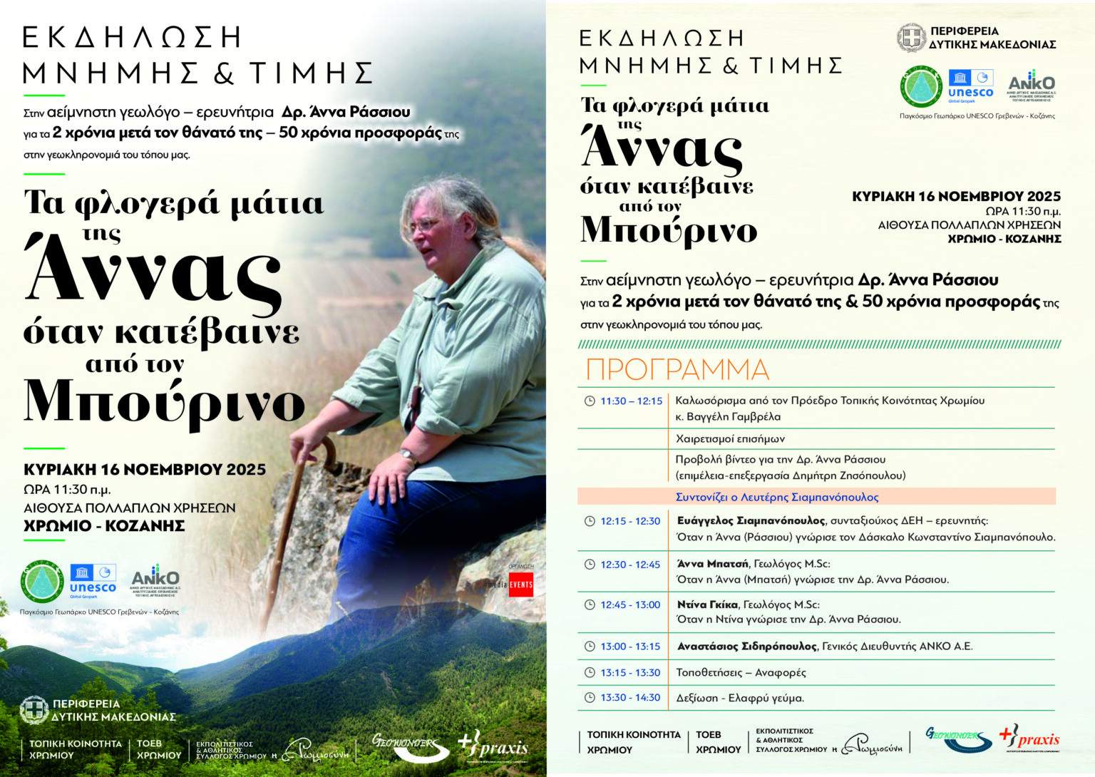 Εκδήλωση μνήμης και τιμής για την αείμνηστη γεωλόγο και ερευνήτρια Δρ. Άννα Ράσσιου θα πραγματοποιηθεί την Κυριακή 16 Νοεμβρίου 2025, στις 11:30 το πρωί, στην Αίθουσα Πολλαπλών Χρήσεων Χρωμίου Κοζάνης. Η Περιφέρεια Δυτικής Μακεδονίας, η Τοπική Κοινότητα Χρωμίου, το Παγκόσμιο Γεωπάρκο UNESCO Γρεβενών – Κοζάνης, ο Εκπολιτιστικός και Αθλητικός Σύλλογος Χρωμίου «Η Ρωμιοσύνη», ο ΤΟΕΒ Χρωμίου, η Κοινωνική Συνεταιριστική Επιχείρηση «ΓεωΘαύμα Ελλάς» και το Ινστιτούτο Επικοινωνίας, Ανάπτυξης & Καινοτομίας +PRAXIS, διοργανώνουν την εκδήλωση με θέμα «Τα φλογερά μάτια της Άννας όταν κατέβαινε από τον Μπούρινο».