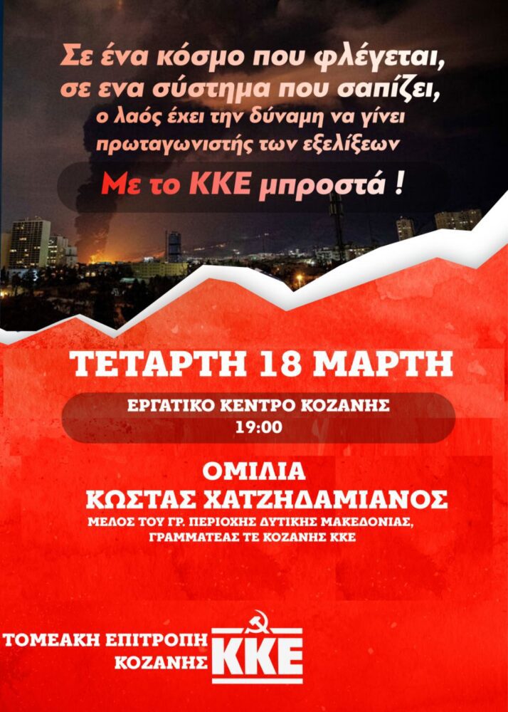 Εκδήλωση – συζήτηση με θέμα «Σε ένα κόσμο που “φλέγεται”, σε ένα σύστημα που σαπίζει, ο λαός έχει τη δύναμη να γίνει πρωταγωνιστής των εξελίξεων με το ΚΚΕ μπροστά» διοργανώνει η Τομεακή Επιτροπή Κοζάνης του ΚΚΕ την Τετάρτη 18 Μαρτίου, στις 7 το απόγευμα, στο Εργατικό Κέντρο Κοζάνης.