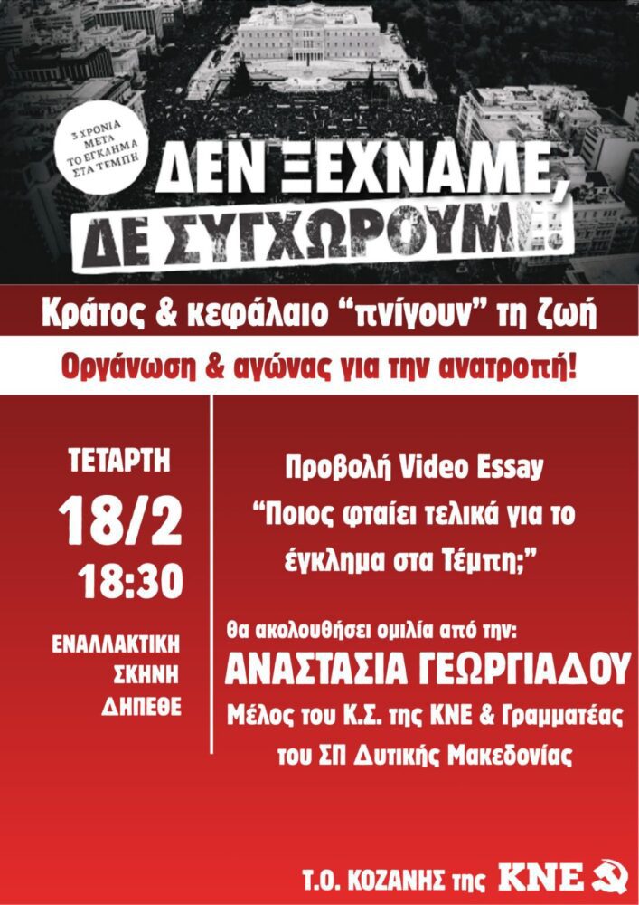 Στο πλαίσιο της εκδήλωσης θα προβληθεί το video essay της ΚΝΕ με τίτλο «Ποιος φταίει τελικά για τα Τέμπη;», ενώ θα πραγματοποιηθεί ομιλία από την Αναστασία Γεωργιάδου, μέλος του ΚΣ της ΚΝΕ και γραμματέα της Οργάνωσης Περιοχής Δυτικής Μακεδονίας της ΚΝΕ.