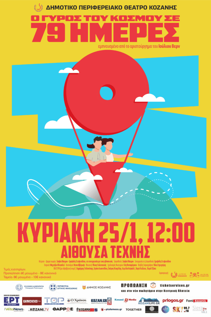 Το Δημοτικό Περιφερειακό Θέατρο Κοζάνης ενώνει τις δυνάμεις του με το Δη.Πε.Θε. Καβάλας και μας καλεί σε ένα μοναδικό ταξίδι, στον «Γύρο του Κόσμου σε 79 μέρες» την Κυριακή 25/1 στις 12:00, στην Αίθουσα Τέχνης.