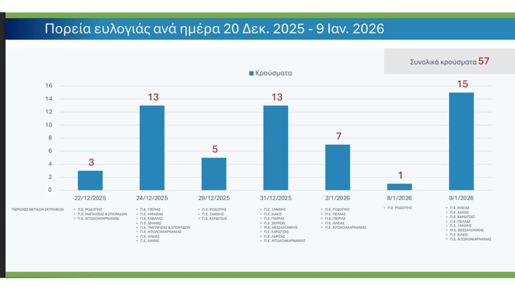 Για την πιο πρόσφατη περίοδο αναφοράς, από τις 20 Δεκεμβρίου 2025 έως τις 9 Ιανουαρίου 2026, καταγράφηκαν 57 νέα κρούσματα σε 16 Περιφερειακές Ενότητες της χώρας, βάσει εργαστηριακών ελέγχων. Στη λίστα αυτή δεν περιλαμβάνονται οι Περιφερειακές Ενότητες της Δυτικής Μακεδονίας, στοιχείο που καταγράφεται ως θετικό από τις αρμόδιες υπηρεσίες, χωρίς ωστόσο να οδηγεί σε εφησυχασμό.