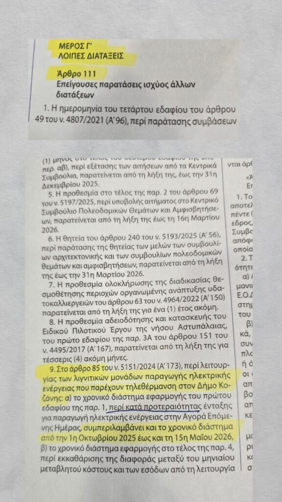 Όπως έκανε γνωστό ο Περιφερειάρχης Δυτικής Μακεδονίας Γιώργος Αμανατίδης, μετά από συνεννόηση με τον Υπουργό Περιβάλλοντος και Ενέργειας Σταύρο Παπασταύρου και τον Υφυπουργό Νικόλαο Τσάφο, δόθηκε παράταση στην κατά προτεραιότητα λειτουργία του ΑΗΣ Αγίου Δημητρίου, με στόχο την απρόσκοπτη εξυπηρέτηση της τηλεθέρμανσης Κοζάνης για τη χειμερινή περίοδο 2025-2026. Σύμφωνα με το άρθρο 111, παράγραφο 9 του νόμου 5243/2025 (31 Οκτωβρίου 2025), η παράταση αφορά το διάστημα από 1 Οκτωβρίου 2025 έως 15 Μαΐου 2026.