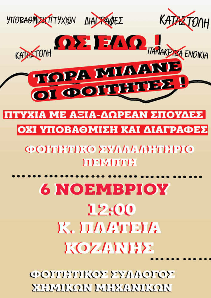 Σε κινητοποιήσεις προχωρούν οι φοιτητές της Κοζάνης, στο πλαίσιο του πανελλαδικού αγωνιστικού συντονισμού των φοιτητικών συλλόγων, διαμαρτυρόμενοι για την κατάσταση στα πανεπιστήμια, τη μεγάλη υποχρηματοδότηση και τα οξυμένα προβλήματα στη φοιτητική μέριμνα. Οι φοιτητικοί σύλλογοι Χημικών Μηχανικών και Ηλεκτρολόγων Μηχανικών & Μηχανικών Υπολογιστών του Πανεπιστημίου Δυτικής Μακεδονίας, συνυπογράφοντας κοινό ψήφισμα, καλούν σε συλλαλητήριο την Πέμπτη 6 Νοεμβρίου στις 12:00 το μεσημέρι στην κεντρική πλατεία Κοζάνης, μαζί με τους μαθητές.