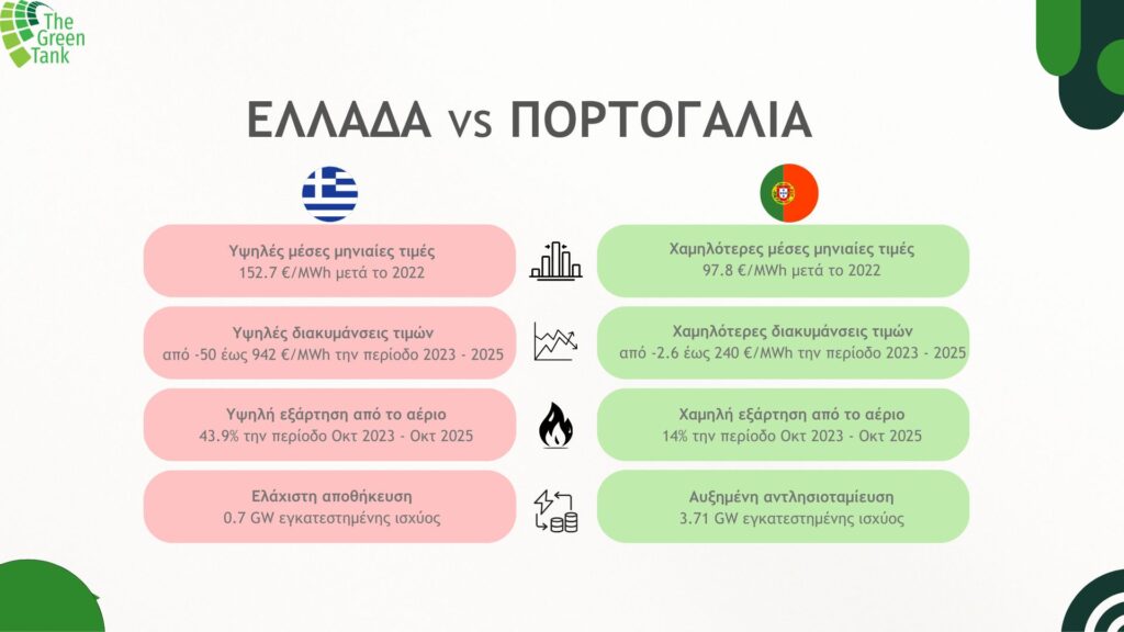 Η διαφορά στο κόστος αντικατοπτρίζεται ξεκάθαρα στις μέσες μηνιαίες τιμές. Μετά το 2022, η Ελλάδα διαμορφώνεται κατά μέσο όρο στα 152.7 €/MWh, έναντι 97.8 €/MWh της Πορτογαλίας.