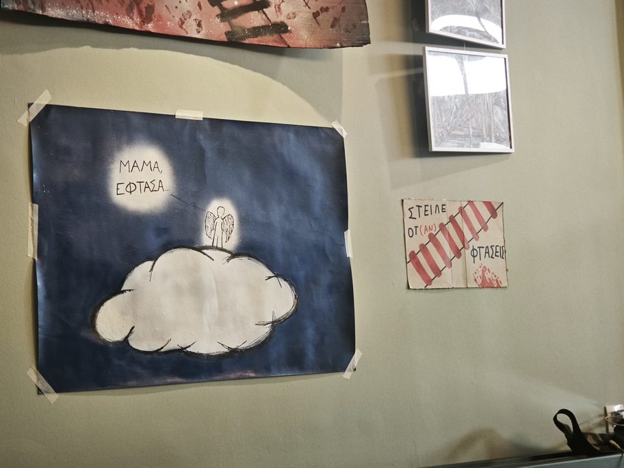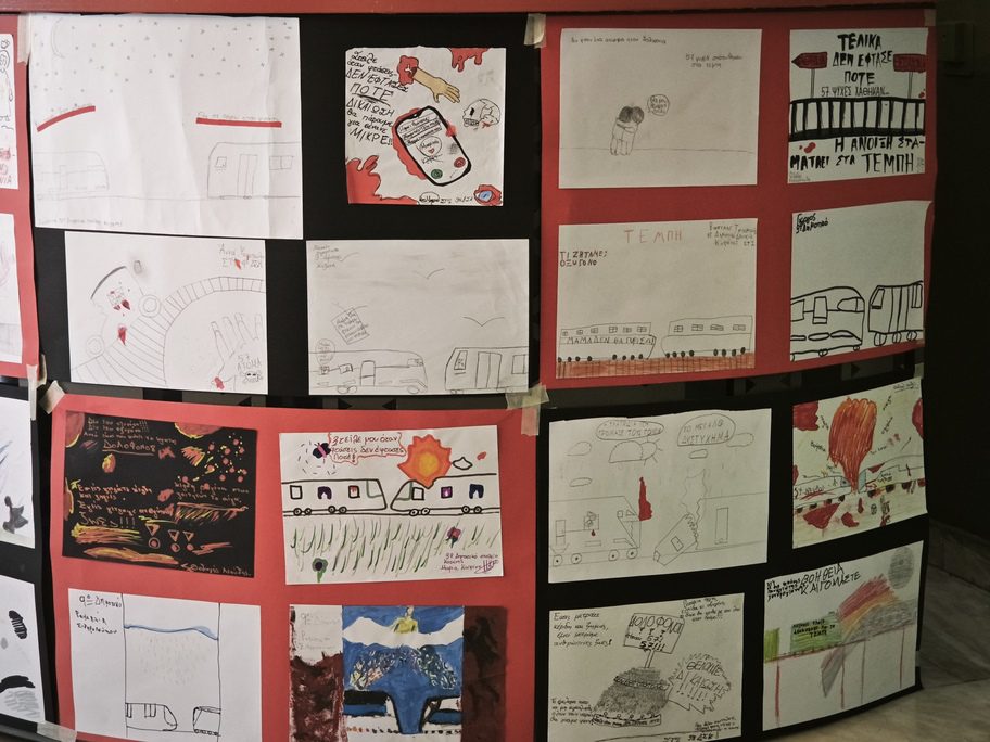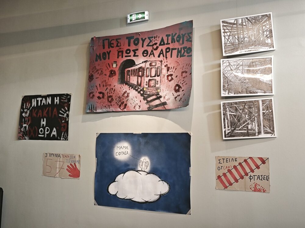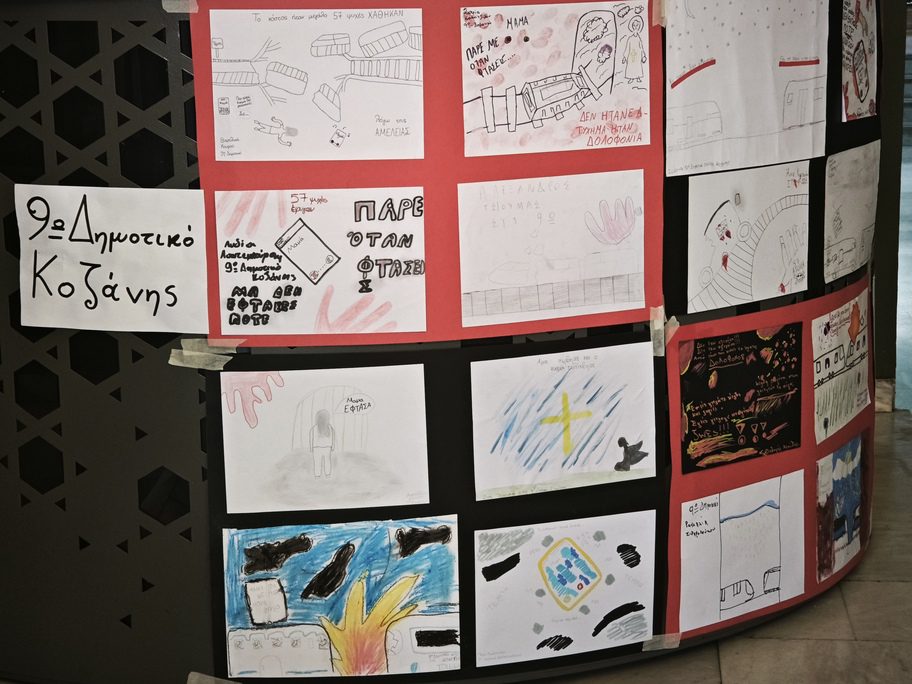 Παράλληλα, στον χώρο λειτούργησε έκθεση ζωγραφικής των μαθητών του 9ου και 12ου Δημοτικού Σχολείου, μια ιδιαίτερη «μικρή κοινότητα μνήμης». Τα έργα τους αποτύπωναν την παιδική ματιά στο συλλογικό τραύμα, υπενθυμίζοντας πως ακόμη και οι πιο μικρές ηλικίες νιώθουν το βάρος της αδικίας.