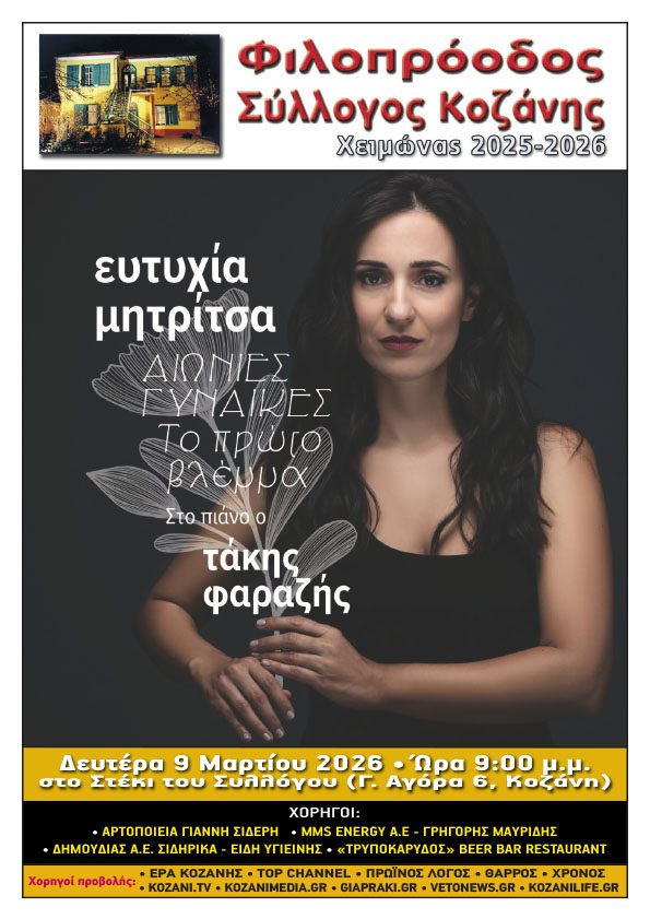 Ο Φιλοπρόοδος Σύλλογος Κοζάνης, σε συνέχεια των μουσικών του εκδηλώσεων για τη νέα χρονιά και με ιδανική αφορμή τον κοντινό εορτασμό της “παγκόσμιας ημέρας της γυναίκας”, σας προσκαλεί σε μια πρωτότυπη μουσική παράσταση όπου η Ευτυχία Μητρίτσα, με την αυθεντική ερμηνευτική της ταυτότητα, υποδέχεται και αφήνεται στην σπάνια μουσική ευαισθησία του Τάκη Φαραζή, για να ξανασυστήσει, μέσα από αυτή τους τη νέα «συνομιλία» το προσωπικό της υλικό και να μας προσκαλέσει σε ένα ταξίδι ανάμεσα σε γυναίκες – σύμβολα και γυναίκες της διπλανής πόρτας.