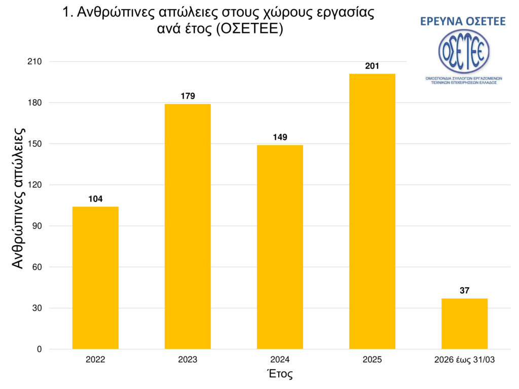 Στη συνέντευξη Τύπου της 28ης Απριλίου, η ΟΣΕΤΕΕ παρουσίασε στοιχεία που καταγράφουν μια δραματική επιδείνωση της κατάστασης. Σύμφωνα με την ανεξάρτητη έρευνα της Ομοσπονδίας, το 2025 έχασαν τη ζωή τους 201 εργαζόμενοι στους χώρους εργασίας, ενώ μέχρι τις 31 Μαρτίου 2026 έχουν ήδη καταγραφεί 37 θάνατοι.