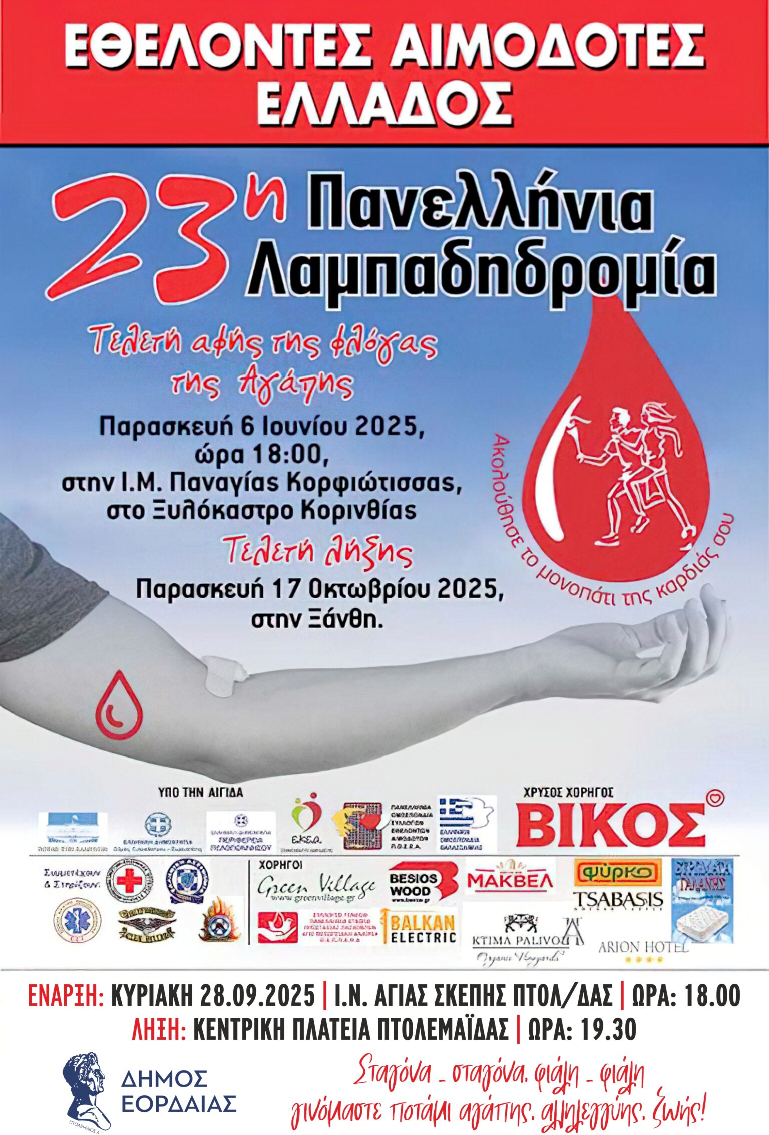 Ο Δήμος Εορδαίας προσκαλεί τους πολίτες να συμμετάσχουν στη Λαμπαδηδρομία Εθελοντών Αιμοδοτών, που θα πραγματοποιηθεί την Κυριακή 28 Σεπτεμβρίου 2025 και ώρα 18:00, με σημείο εκκίνησης τον Ιερό Ναό Αγίας Σκέπης Πτολεμαΐδας και τερματισμό στην Κεντρική Πλατεία της πόλης.