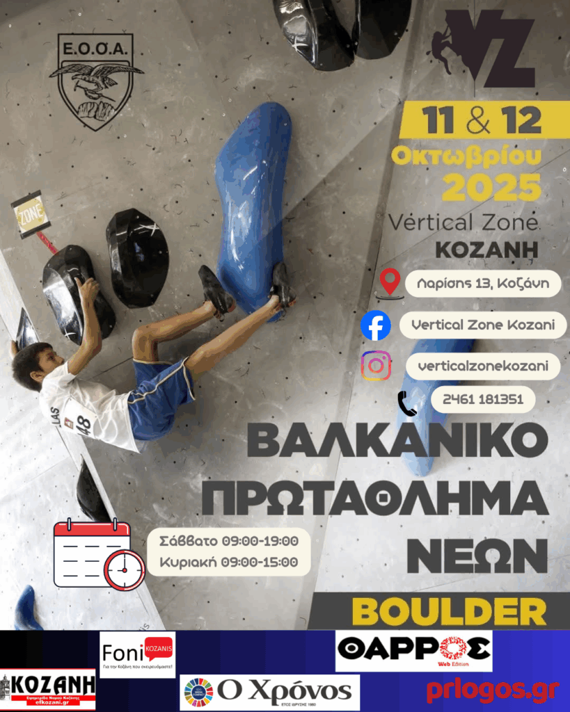 Το Vertical Zone Climbing Wall, υπό την αιγίδα της Ελληνικής Ομοσπονδίας Ορειβασίας και Αναρρίχησης, έχει την τιμή να φιλοξενήσει στην πόλη της Κοζάνης το Βαλκανικό Πρωτάθλημα Νέων, στο αγώνισμα της αναρρίχησης τύπου Boulder.
