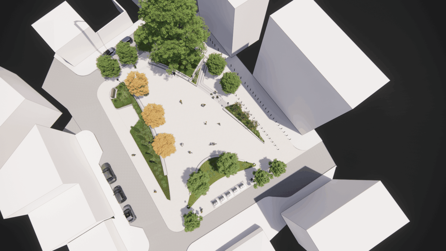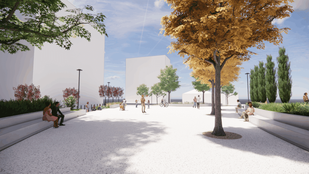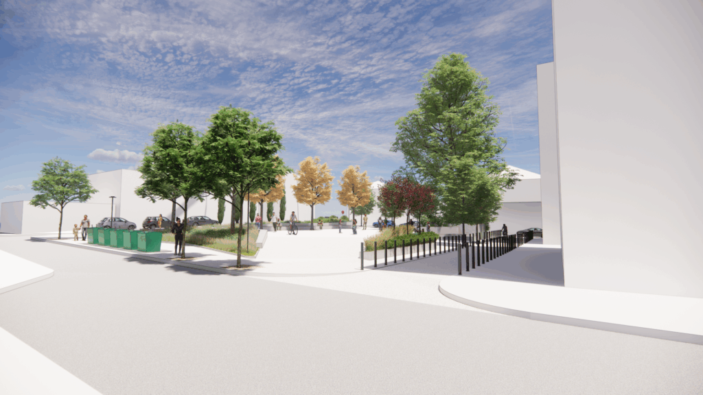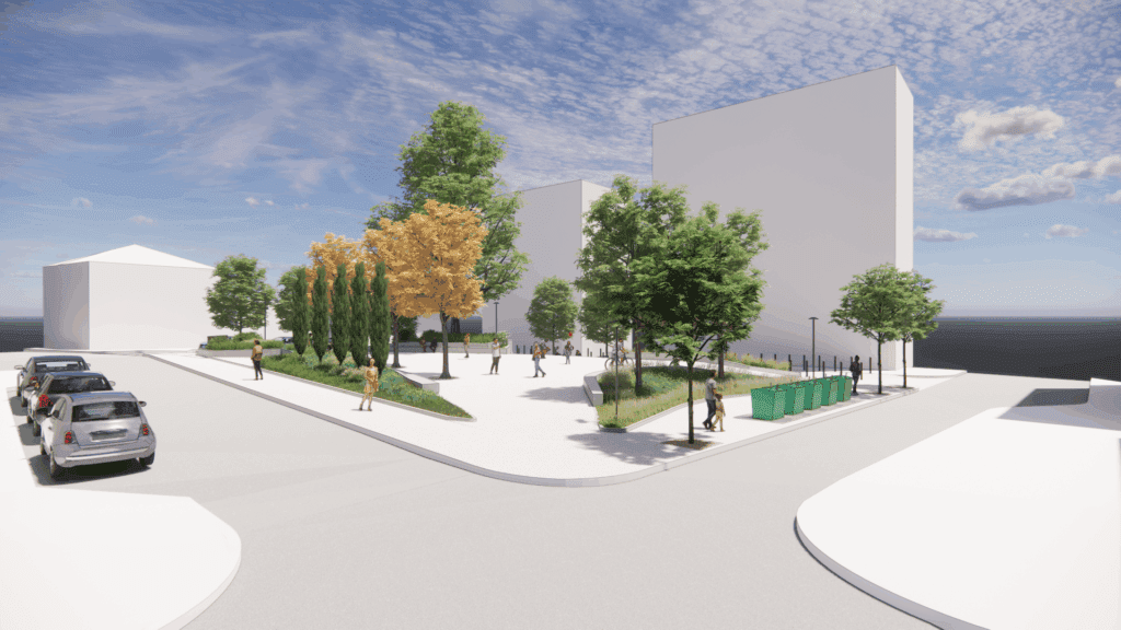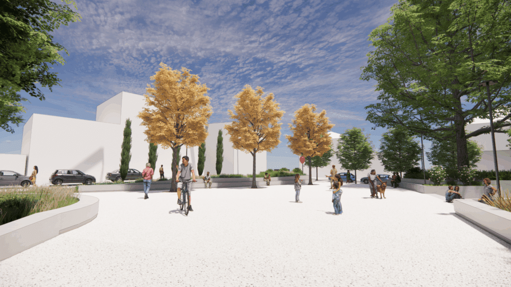 Κεντρική επιλογή του σχεδιασμού είναι η ύπαρξη ενός ανοιχτού, ενιαίου αστικού χώρου στο κέντρο της πλατείας, μια «σκληρή» επιφάνεια, κατάλληλη για πολιτιστικές δράσεις, χορούς και εκδηλώσεις. Περιμετρικά αναπτύσσονται πράσινες ζώνες με φύτευση, δημιουργώντας αίσθηση ιδιωτικότητας και ασφαλές περιβάλλον για τα παιδιά.