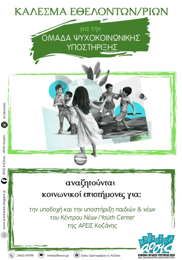 Η ομάδα ψυχοκοινωνικής υποστήριξης της ΑΡΣΙΣ Κοζάνης απευθύνει κάλεσμα σε εθελοντές και εθελόντριες που επιθυμούν να συμβάλλουν ενεργά στην υποστήριξη ανθρώπων που ζουν σε συνθήκες φτώχειας και βιώνουν τις συνέπειες του κοινωνικού αποκλεισμού.
