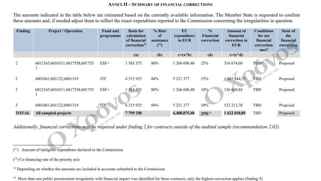 Η Ευρωπαϊκή Επιτροπή προτείνει μάλιστα δημοσιονομική διόρθωση ύψους 25% στα συμβόλαια που εξετάστηκαν. Για το δείγμα των έργων που ελέγχθηκαν η διόρθωση αυτή αντιστοιχεί σε ποσό σχεδόν δύο εκατομμυρίων ευρώ, ενώ επισημαίνεται ότι αντίστοιχες διορθώσεις μπορεί να εφαρμοστούν και σε άλλα συμβόλαια εκτός του δείγματος, εφόσον διαπιστωθεί ότι παρουσιάζουν τα ίδια χαρακτηριστικά.