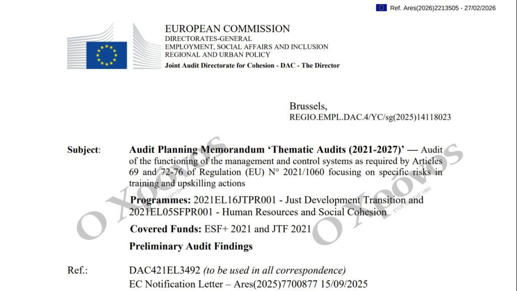 Το audit των ευρωπαϊκών υπηρεσιών ελέγχου, με ημερομηνία 27 Φεβρουαρίου 2026, εξετάζει προγράμματα κατάρτισης που χρηματοδοτούνται από το Ευρωπαϊκό Κοινωνικό Ταμείο (ESF+) και το Ταμείο Δίκαιης Μετάβασης (JTF) για την περίοδο 2021-2027. Στο δείγμα του ελέγχου περιλαμβάνονται επτά έργα που αφορούν ευάλωτες κοινωνικές ομάδες, ανέργους και εργαζόμενους, μεταξύ των οποίων δράσεις απασχόλησης για ανέργους στις περιοχές Δίκαιης Αναπτυξιακής Μετάβασης, αλλά και προγράμματα συμβουλευτικής, κατάρτισης και πιστοποίησης δεξιοτήτων. Πρόκειται για τα προγράμματα reskilling και upskilling που αποτέλεσαν «σκιά» στην χρηματοδότηση εταιρειών εκτός Δυτικής Μακεδονίας για να «τρέξουν» στην περιοχή με υπεργολαβίες.