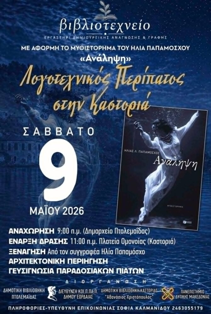 Το Βιβλιοτεχνείο διοργανώνει έναν ιδιαίτερο λογοτεχνικό περίπατο στην Καστοριά, με αφετηρία το μυθιστόρημα του Ηλία Παπαμόσχου, «Ανάληψη», και σας καλεί να συμμετάσχετε σε μια εμπειρία όπου η λογοτεχνία συναντά τον τόπο και την αφήγηση.