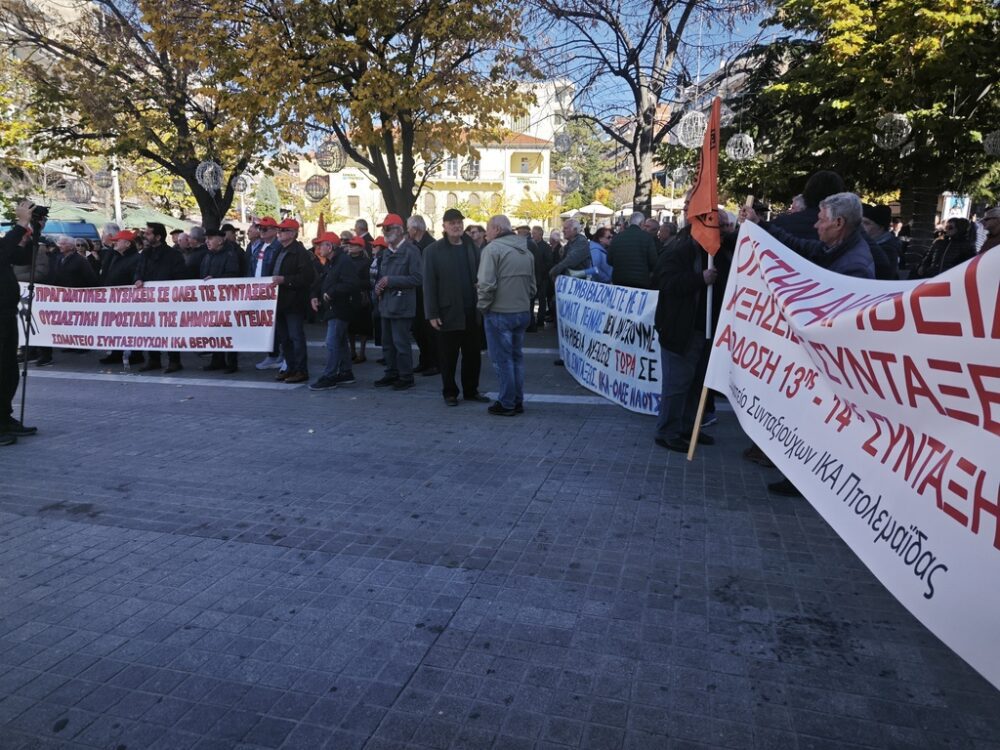 Με πολύ μεγάλη συμμετοχή πραγματοποιήθηκε το παμμακεδονικό συλλαλητήριο των συνταξιούχων του δημόσιου και ιδιωτικού τομέα το πρωί της Πέμπτης στην Κοζάνη. Πλήθος κόσμου, σωματείων και συνταξιούχων από τη Δυτική Μακεδονία αλλά και από όμορες περιοχές βρέθηκαν στην κινητοποίηση, με εμφανή τη συμμετοχή των Σωματείων Συνταξιούχων ΙΚΑ Βέροιας, Νάουσας, Κοζάνης, Καστοριάς και Πτολεμαΐδας, του ΠΑΣΑΣ ΔΕΗ, των Σωματείων Συνταξιούχων ΟΑΕΕ Κοζάνης, Νάουσας, Γρεβενών και Καστοριάς, καθώς και του ΣΕΑ Συνταξιούχων Νομού Κοζάνης.