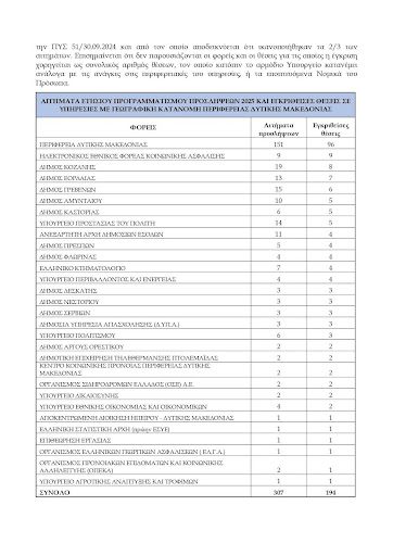 Σε ό,τι αφορά τον Ετήσιο Προγραμματισμό Προσλήψεων 2025, για τη στελέχωση των υπηρεσιών που βρίσκονται στη γεωγραφική Περιφέρεια Δυτικής Μακεδονίας, από τα αιτήματα που υποβλήθηκαν, όπως προκύπτει από τον σχετικό πίνακα που συνοδεύει την απάντηση και αποτυπώνει τα αιτήματα των υπηρεσιών και τον αριθμό των θέσεων που εγκρίθηκαν με την ΠΥΣ 51/30.09.2024, ικανοποιήθηκαν τα δύο τρίτα αυτών. Δεν αποτυπώνονται, ωστόσο, οι φορείς και οι θέσεις για τις οποίες η έγκριση δίνεται ως συνολικός αριθμός, τον οποίο στη συνέχεια κάθε υπουργείο κατανέμει στις περιφερειακές του υπηρεσίες ή στα εποπτευόμενα νομικά πρόσωπα.