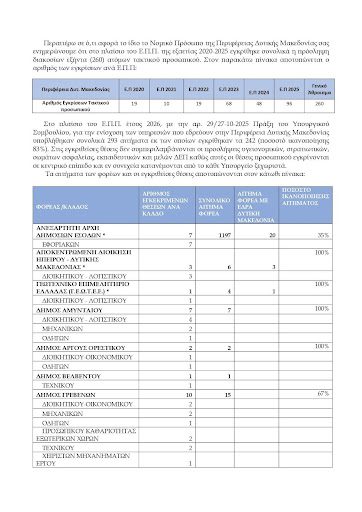 Για το 2026, όπως αναφέρει ο βουλευτής βάσει της απάντησης, υποβλήθηκαν συνολικά 293 αιτήματα για την ενίσχυση των υπηρεσιών που εδρεύουν στη Δυτική Μακεδονία, εκ των οποίων με την Πράξη 29/27-10-2025 του Υπουργικού Συμβουλίου εγκρίθηκαν τα 242, ποσοστό ικανοποίησης 83%. Και σε αυτή την περίπτωση, στις εγκριθείσες θέσεις δεν περιλαμβάνονται οι προσλήψεις υγειονομικών, στρατιωτικών, σωμάτων ασφαλείας, εκπαιδευτικών και μελών ΔΕΠ, καθώς η έγκριση και κατανομή τους ακολουθεί ξεχωριστή διαδικασία σε κεντρικό επίπεδο.
