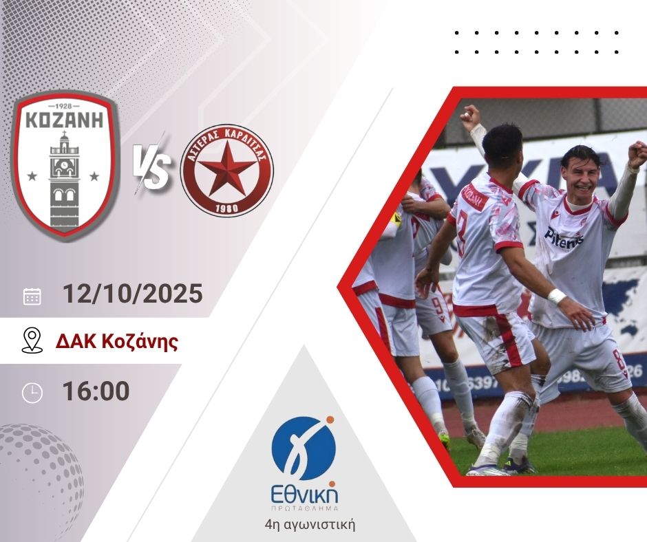 Μεγάλη αναμένεται να είναι η αναμέτρηση της Κυριακής 12 Οκτωβρίου 2025 στο ΔΑΚ Κοζάνης, όπου το ΦΣ Κοζάνη υποδέχεται στις 4:00 μ.μ. τον Αστέρα Καρδίτσας, στο πλαίσιο της 4ης αγωνιστικής του 2ου Ομίλου της Γ’ Εθνικής. Η ομάδα επιστρέφει στην έδρα της με μοναδικό στόχο την πρώτη της νίκη στο πρωτάθλημα, έχοντας στις αποσκευές της τον πολύτιμο βαθμό που απέσπασε εκτός έδρας απέναντι στον Απόλλωνα Καλαμαριάς, σε ένα παιχνίδι όπου είχε τις ευκαιρίες να φύγει νικήτρια.