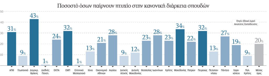 Ο εθνικός μέσος όρος αποφοίτησης στην κανονική διάρκεια των σπουδών είναι 20%, δηλαδή ένας στους πέντε αποφοίτησε εντός του ελάχιστου χρόνου σπουδών. Δεκατρία από τα 22 ΑΕΙ έχουν ποσοστό αποφοίτων στην κανονική διάρκεια σπουδών πάνω από τον μέσο όρο.