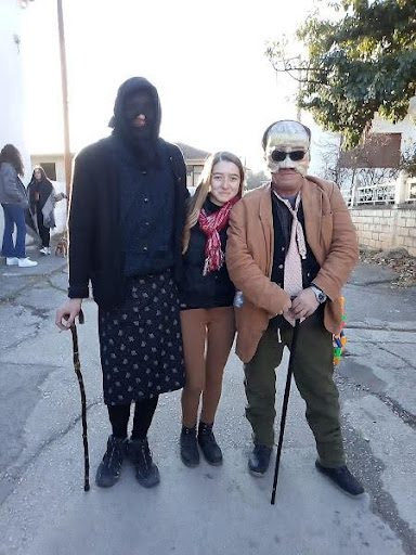Η γραία φοράει μαύρο μαντήλι στα μαλλιά, καλύπτει το πρόσωπό της με ένα λεπτό μαύρο ύφασμα αφήνοντας άνοιγμα για το στόμα, φοράει σκούρο μπλε πουκάμισο και μαύρη ζακέτα από πάνω. Η φούστα της φτάνει μέχρι τη γάμπα και έχει σκούρο μπλε χρώμα με πολλά όμοια γαλάζια σχέδια. Φοράει χοντρό μαύρο καλσόν, μαύρα παλιά παπούτσια και κρατάει στο δεξί της χέρι ξύλινο μπαστούνι. Στην πλάτη της έχει ένα ψάθινο καλάθι που σε κάποια στιγμή της ημέρας της το βάζουν φωτιά και αυτή το βγάζει αφήνοντάς το να καεί. Από τον δεξί ώμο της κρέμεται μια πλεκτή μάλλινη τσάντα. Επίσης, μπορεί να καπνίζει και να έχει μικρό μπουκάλι με τσίπουρο μαζί της.