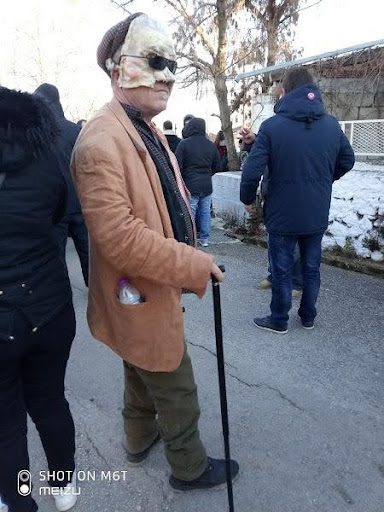 Γέρον, γραία (γέρος, γριά): Είναι περιφερειακά πρόσωπα και συνέχεια τσακώνονται. Έχουν τους δικούς τους διαλόγους και συχνά ¨πειράζουν¨ ο ένας τον άλλον. Μπορεί να επιδοθούν σε μίμηση ερωτικών πράξεων είτε μεταξύ τους είτε με τον κόσμο που παρακολουθεί. Ο γέρον φοράει σκουρόχρωμο καρό καπέλο, μάσκα χειροποίητη που καλύπτει το πρόσωπο μέχρι την μύτη, καφέ σακάκι που στην τσέπη του έχει ένα μπουκάλι τσίπουρο και το πίνει κατά την διάρκεια του δρωμένου κερνώντας παράλληλα και άλλους. Ακόμη, φοράει μαύρο γιλέκο, πουκάμισο καρό σκουρόχρωμο, άσπρη γραβάτα με πυκνό κόκκινο πουά σχέδιο και λαδί παντελόνι. Κρατάει ένα μπαστούνι και κάποιες φορές βάζει και μαύρα γυαλιά ηλίου. Αριστερά από την τσέπη του σακακιού του κρέμονται μεγάλες πολύχρωμες χάντρες που μοιάζουν με κομπολόι.