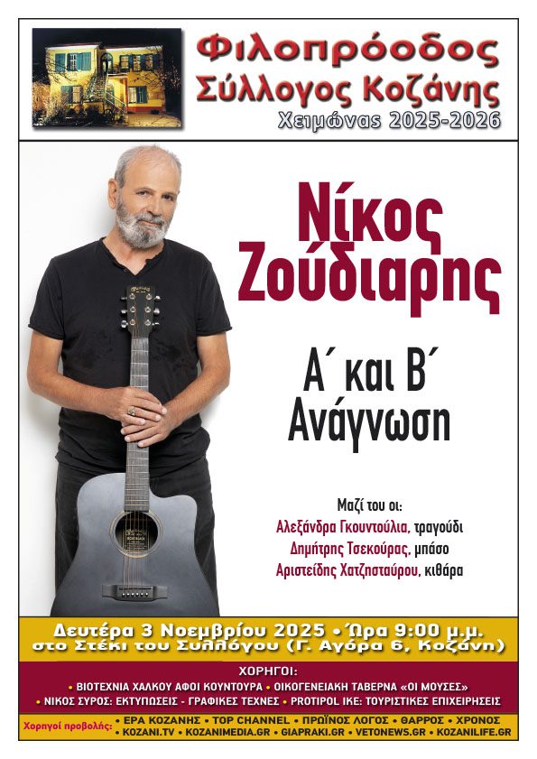 Ο Φιλοπρόοδος Σύλλογος Κοζάνης καθώς περνάμε στη χειμερινή περίοδο, ξεκινά τον νέο κύκλο των μουσικών του εκδηλώσεων, στους ζεστούς και φιλόξενους χώρους του Αρχοντικού μας και σας προσκαλεί να υποδεχτούμε μαζί έναν σπουδαίο, σύγχρονο μουσικό δημιουργό – κόσμημα για το Ελληνικό τραγούδι, τον Νίκο Ζούδιαρη, που έρχεται να ξεδιπλώσει το σύνολο του σημαντικού του ρεπερτορίου σε μια παράσταση με τίτλο «Α’ & Β’ Ανάγνωση».