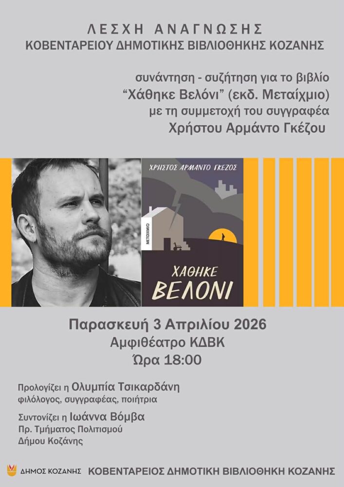 Με τη συμμετοχή του συγγραφέα Χρήστου Αρμάντο Γκέζου θα πραγματοποιηθεί η επόμενη συνάντηση της Λέσχης Ανάγνωσης, την 3η Απριλίου 2026, στο αμφιθέατρο της Βιβλιοθήκης Κοζάνης. Η εκδήλωση σηματοδοτεί την ολοκλήρωση του αφιερώματος στη Βαλκανική Λογοτεχνία, με αφορμή το βιβλίο «Χάθηκε Βελόνι», γύρω από το οποίο θα αναπτυχθεί η συζήτηση.