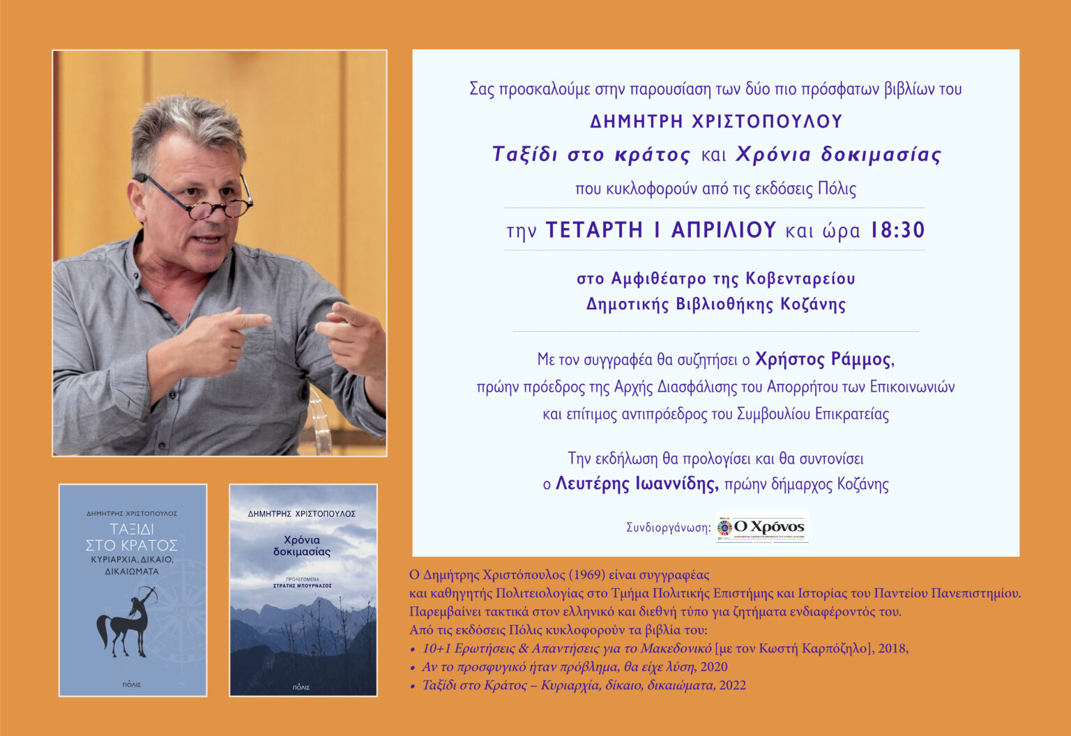 Στην Κοζάνη θα παρουσιαστούν τα δύο πιο πρόσφατα βιβλία του Δημήτρη Χριστόπουλου, «Ταξίδι στο κράτος» και «Χρόνια δοκιμασίας», σε εκδήλωση που θα πραγματοποιηθεί την Τετάρτη 1 Απριλίου στις 18:30, στο Αμφιθέατρο της Δημοτικής Βιβλιοθήκης. Η παρουσίαση διοργανώνεται από τις εκδόσεις Πόλις, σε συνεργασία με την εφημερίδα «Χρόνος» και τη Στοά του Βιβλίου, και εντάσσεται στο πλαίσιο των πολιτιστικών δράσεων που αναδεικνύουν τον δημόσιο διάλογο γύρω από σύγχρονα πολιτικά και κοινωνικά ζητήματα.