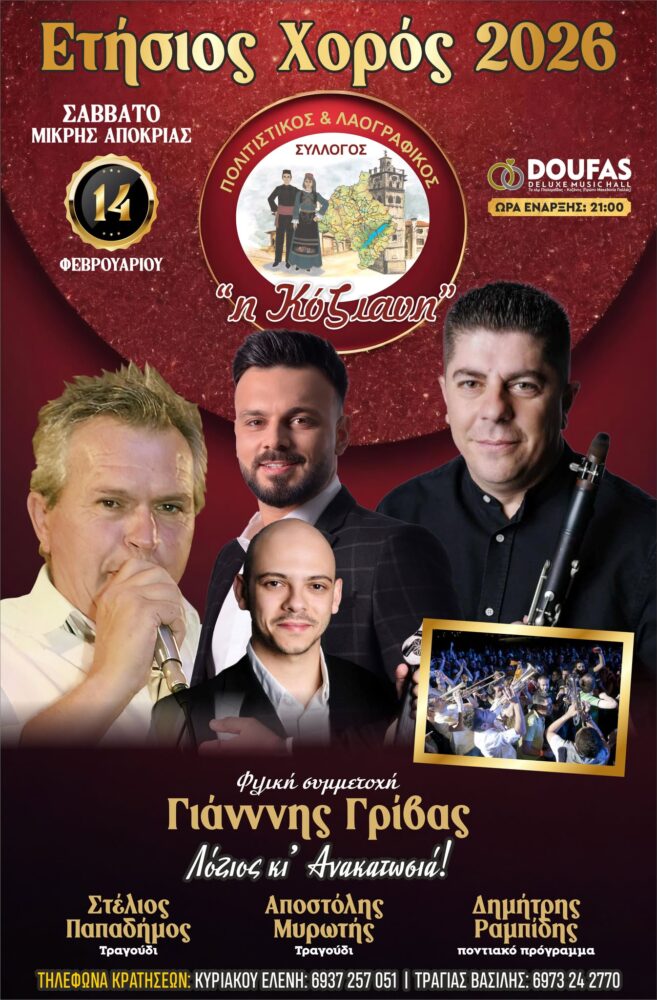 Ο Πολιτιστικός & Λαογραφικός Σύλλογος – Φανός «Η Κοζάνη» σας προσκαλεί στον ετήσιο χορό του, το Σάββατο 14 Φεβρουαρίου 2026, στο Doufas Deluxe Music Hall, σε μια μεγάλη γιορτή παράδοσης, μουσικής και διασκέδασης.