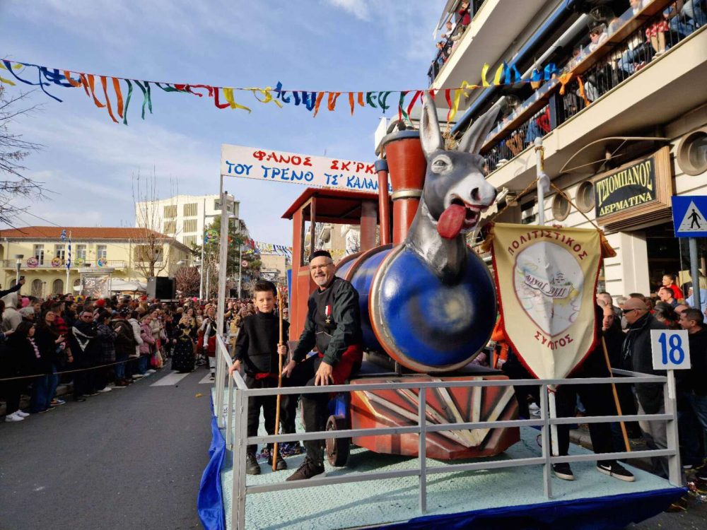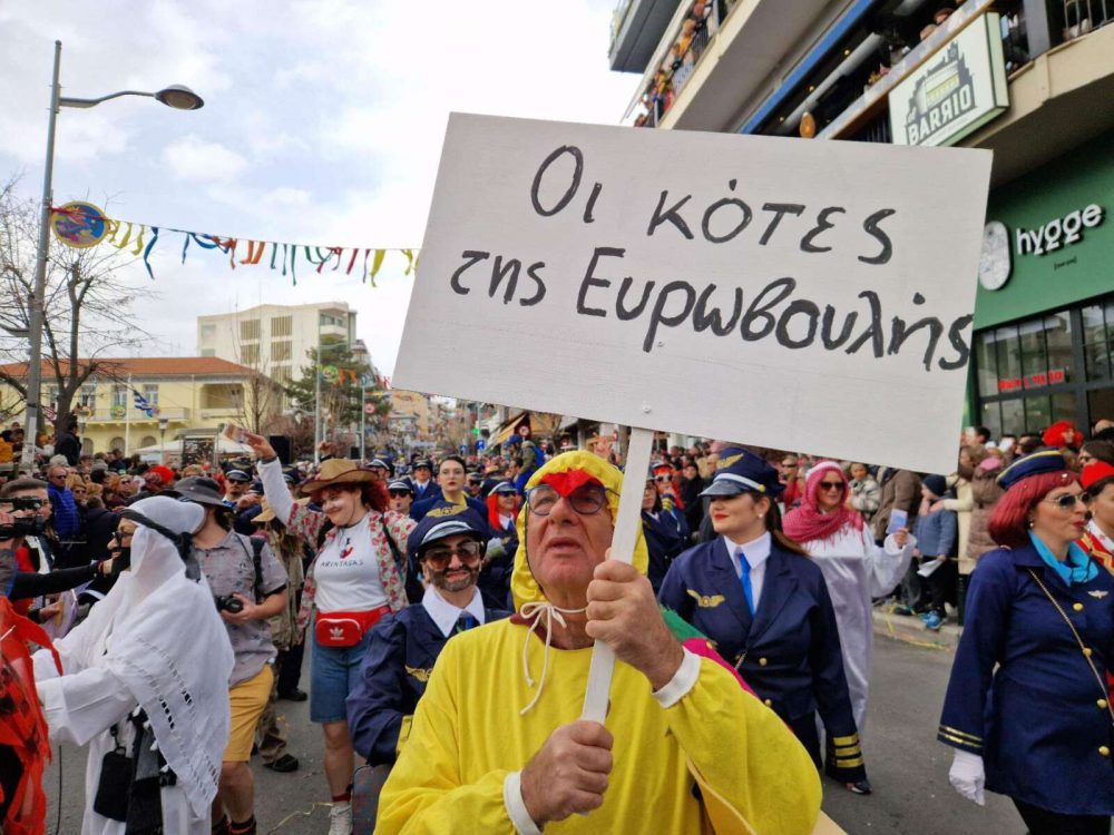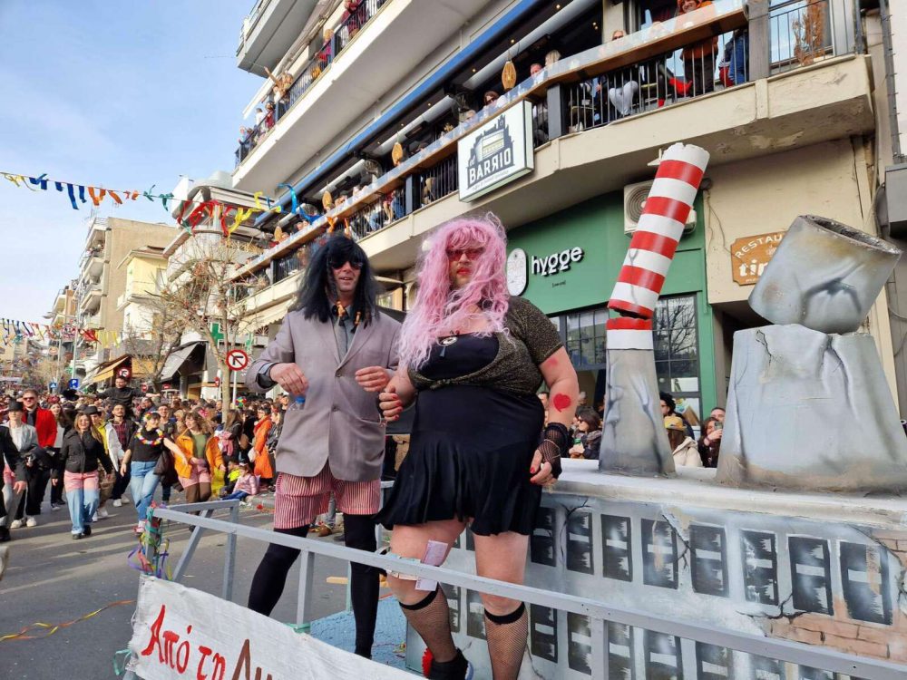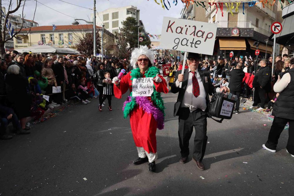 Το μεσημέρι της Κυριακής, στην παρέλαση των αρμάτων, πρωταγωνίστησε η επικαιρότητα με θέματα όπως τα φωτοβολταϊκά, το Καταργκέϊτ, αλλά και ο έρωτας Βανδή Μπισμπίκη.