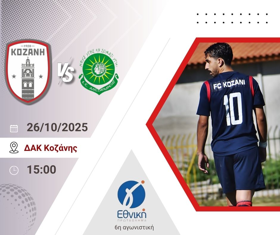 Το Φ.Σ. Κοζάνη επιστρέφει την Κυριακή 26 Οκτωβρίου 2025 στη φυσική της έδρα, το ΔΑΚ Κοζάνης, όπου στις 15:00 (λόγω αλλαγής ώρας σε χειμερινή) θα αντιμετωπίσει την Α.Ε. Αλεξάνδρειας στο πλαίσιο της 6ης αγωνιστικής του πρωταθλήματος της Γ’ Εθνικής (2ος Όμιλος).