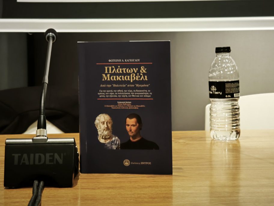 Αναφερόμενος στο περιεχόμενο της μελέτης, σημείωσε ότι το βιβλίο «Πλάτων και Μακιαβέλι – Από την Πολιτεία στον Ηγεμόνα» εξετάζει δύο από τους σημαντικότερους στοχαστές της πολιτικής φιλοσοφίας και επιχειρεί να αναδείξει τη βαθιά διαφορά ανάμεσα στην αρχαία και τη νεωτερική αντίληψη για την πολιτική. Μέσα από τη σύγκριση των ιδεών του Πλάτωνα και του Μακιαβέλι, όπως εξήγησε, αναδεικνύεται η μετάβαση από μια πολιτική σκέψη που συνδέεται στενά με την ηθική και τη δικαιοσύνη σε μια ρεαλιστική θεώρηση της εξουσίας και της κυβέρνησης. Όπως υπογράμμισε, όλα τα παραπάνω δεν μπορούν να αποτελέσουν μια απλή αναδρομή στο παρελθόν ούτε μια απλή φιλοσοφική σύγκριση. «Δεν συγκρίνουν απλά δεδομένα σαν να πρόκειται για απλές μαθηματικές πράξεις», ανέφερε χαρακτηριστικά, σημειώνοντας ότι αποτελούν μια ισχυρή ερμηνεία του σημερινού κόσμου, γεγονός που καθιστά το έργο της Κλαίρης – Φωτεινής Καγιόγλου ιδιαίτερα επίκαιρο.