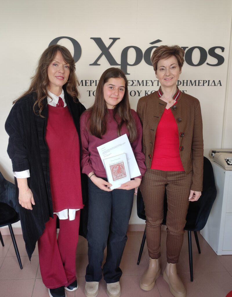 Το πρωί της Δευτέρας 2 Μαρτίου η Φωτεινή, συνοδευόμενη από την διευθύντρια του 6ου Γυμνασίου Νικολέτα Σταθοπούλου και την καθηγήτρια Σοφία Καλαμάρα που μαζί με την Ελένη Παπαδοπούλου είναι οι υπεύθυνες καθηγήτριες για το σχολείο του βραβευμένου μαθητικού περιοδικού «Όνειρα Ψυχών», επισκέφθηκε τα γραφεία του «Χ» για να παραλάβει το βιβλίο. Μαζί με το βιβλίο παρέλαβε και το μήνυμα του Γιώργου Τζέλλου με την ευχή και την προτροπή να διαβάσει το βιβλίο και να ενισχύσει ακόμα περισσότερο την επιθυμία της να διαβάζει και να γράφει.