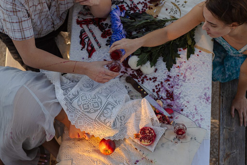 H συνάντηση με τα βιβλία του συγγραφέα Παντελή Μπουκάλα «Το αίμα της Αγάπης» και «Μηλιά μου αμίλητη» ήταν η αφορμή για ένα ταξίδι πίσω στην παράδοση και το αίμα που εκείνη κουβαλάει. Πόσες ιστορίες μάς αφηγήθηκαν για την αγάπη… Μήπως η ιστορία είναι μία; Κι η ρίζα της ξεκίνησε από ένα μήλο; Κόκκινο όπως το αίμα. Αίμα που χύνεται στο όνομά της ή και στο άκουσμά της, στις αφηγήσεις των γιαγιάδων, στα τραγούδια και τα ποιήματα. Αίμα γυναικών. Ρούχο ματωμένο που ‘χει κολλήσει πάνω στο γυναικείο κορμί, που το σέρνει όπως την ουρά του νυφικού, που το κουβαλάει από πριν, σαν το προπατορικό αμάρτημα. Το δαγκωμένο μήλο. Γυναίκες που πόθησαν την ελευθερία, που ονειρεύτηκαν να ζήσουν αλλιώς και δεν πρόλαβαν. Τα σεντόνια όπου φύλαξαν τους κρυφούς τους πόθους, τους καρπούς των ονείρων τους, εκεί όπου επέστρεφαν όταν ένιωθαν την ανάγκη για καταφύγιο. Κι εκεί συναντηθήκαμε με το έργο «Flag» της εικαστικού Γεωργίας Λαλέ, το οποίο αποτέλεσε έμπνευση για εμάς και προβάλλεται στην παράσταση. Η σύνδεση της παράδοσης με τη σύγχρονη Ελλάδα. Πόσο παρελθόν κουβαλάει το παρόν που ζούμε; Περπατάμε ανάποδα στον χρόνο, πέφτουμε πάνω σε ιστορίες γυναικών, ιστορίες αίματος και τραυμάτων. Περπατάμε ανάποδα στον χρόνο και θυμόμαστε το παιδικό τραγούδι : «’Ενα- δύο- τρία, πήγα στην κυρία, μου ‘δωσε ένα μήλο, μήλο δαγκωμένο, το ‘δωσα στην κόρη κι έκανε… Αγόρι.» Μέσα από λαϊκά τραγούδια ή και όχι τόσο λαϊκά, μύθους, ιστορίες παλιές αλλά και σύγχρονες, μνήμες των παιδικών μας χρόνων και αφηγήσεις γυναικών, χαρτογραφούμε την ενεργό μυθολογία μας γύρω από το αίμα που πνίγει εδώ και αιώνες τις γυναίκες και τις θηλυκότητες.