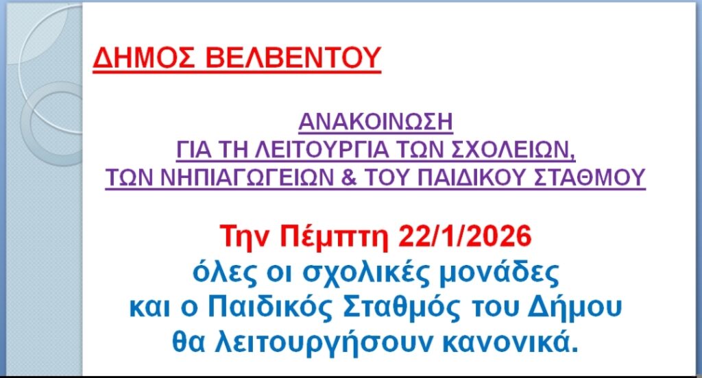 Πώς θα λειτουργήσουν οι σχολικές μονάδες αύριο στο Βελβεντό Τελευταία ενημέρωση: 21 Ιανουαρίου 2026 20:25 από Χρόνος Κοζάνης Share 0 Min Read SHARE ΕΤΙΚΕΤΕΣ:ΒελβεντόΔελτία Τύπου Μοιραστείτε την είδηση Facebook Twitter Αντιγραφή συνδέσμου Εκτύπωση ΡΟΗ ΕΙΔΗΣΕΩΝ Η λειτουργία των σχολικών μονάδων αύριο στο Βόϊο Πώς θα λειτουργήσουν οι σχολικές μονάδες αύριο στο Βελβεντό Τι θα γίνει με τα σχολεία αύριο στον Δήμο Σερβίων Κανονικά αύριο η λειτουργία των σχολικών μονάδων στην Κοζάνη “Μπλόκο» του Ευρωκοινοβουλίου στην συμφωνία ΕΕ – Mercosur Που κινούνται κανονικά τα οχήματα και που χρειάζονται αλυσίδες στη Δυτική Μακεδονία Voice Logica και Databank Solutions οδηγούν τον ψηφιακό μετασχηματισμό του ΚΤΕΛ Κοζάνης με AI Voice Agent Πρωινές εκπαιδευτικές δράσεις για μαθητές Δημοτικού στην Κοβεντάρειο Βιβλιοθήκη Τερματίζεται το μπλόκο της Σιάτιστας μετά από περισσότερες από 50 ημέρες Χωρίς αλλαγές τα τιμολόγια της Δ.Ε.Υ.Α. Κοζάνης το 2026