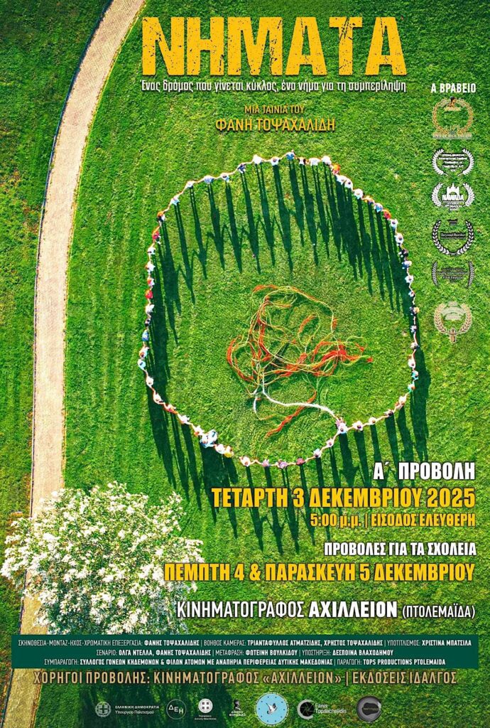 Η Πτολεμαΐδα υποδέχεται την πρώτη δημόσια προβολή της ταινίας/ντοκιμαντέρ «Νήματα» του Φάνη Τοψαχαλίδη, ενός έργου που γεννήθηκε από το πολιτιστικό – συμπεριληπτικό πρόγραμμα του Συλλόγου γονέων, κηδεμόνων και φίλων ΑμεΑ Περιφέρειας Δυτικής Μακεδονίας, σε καλλιτεχνική επιμέλεια και σχεδιασμό της Όλγας Ντέλλα. Η Α’ προβολή θα πραγματοποιηθεί την Τετάρτη 3 Δεκεμβρίου 2025, στις 17:00, στον κινηματογράφο «Αχίλλειον» με ελεύθερη είσοδο, παρουσία συντελεστών της ταινίας.