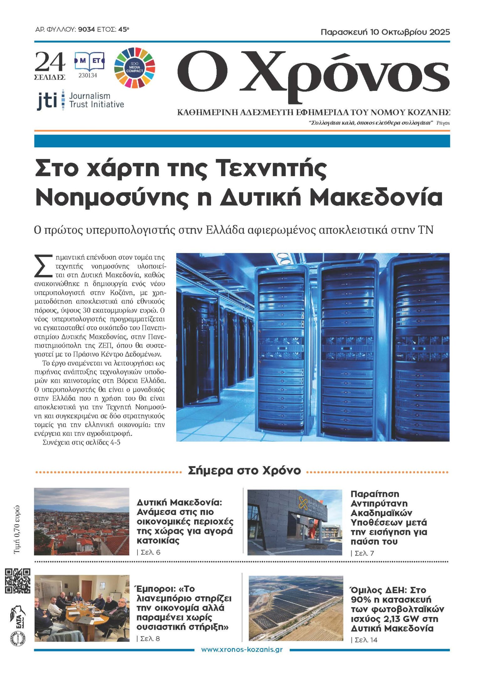 Πρωτοσέλιδο Παρασκευής 10 Οκτωβρίου 2025 Τελευταία ενημέρωση: 9 Οκτωβρίου 2025 20:48 από Χρόνος Κοζάνης Share SHARE ΕΤΙΚΕΤΕΣ:εφημερίδαΟ Χρόνος Κοζάνηςπρωτοσέλιδο Μοιραστείτε την είδηση Facebook Twitter Αντιγραφή συνδέσμου Εκτύπωση ΡΟΗ ΕΙΔΗΣΕΩΝ Υπογράφηκε η σύμβαση για τη συντήρηση πεζοδρομίων σε Κοίλα και Χαραυγή Αναβάθμιση και συντήρηση αθλητικών υποδομών στον Δήμο Κοζάνης Φωταγώγηση του Χριστουγεννιάτικου Δέντρου με το Γιώργο Λιβάνη στις 10 Δεκεμβρίου στην κεντρική πλατεία Πτολεμαΐδας Η Δυτική Μακεδονία στο μικροσκόπιο για τα «έξυπνα» υδρόμετρα Σεμινάριο: “Digital Marketing & Social Media – Από τη Θεωρία στην Πράξη” στην Πτολεμαΐδα “Envisioning the Future of Communication III”: Εξελίξεις, τάσεις και προοπτικές της επικοινωνίας στο διεθνές συνέδριο του Πανεπιστημίου Δυτικής Μακεδονίας Δημόσια Διαβούλευση για το Πρόγραμμα Τουριστικής Προβολής της Περιφέρειας Εκδήλωση με τίτλο «Πολιτισμός και Οικονομία – Η γέφυρα για το Forum 2026» Καταγγελίες για το ΠΔΜ: Νέα επιστολή απάντηση της καθηγήτριας Σωτηρίας Τριαντάρη “Ισες Φωνές”: Εκδήλωση για την Παγκόσμια Ημέρα Ατόμων με Αναπηρία